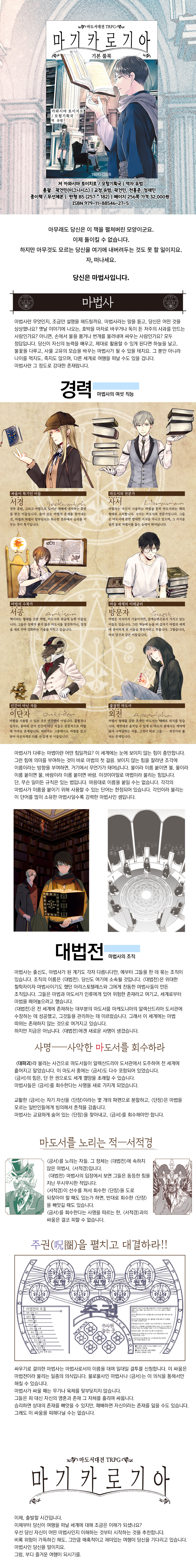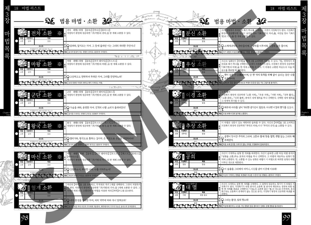 여기에는 마법, 원형, 아이템 등 플레이어 캐릭터가 사용할 데이터를 수록했습니다. 자신의 마법사가 사용할 수 있는 마법부터 읽어봅시다.