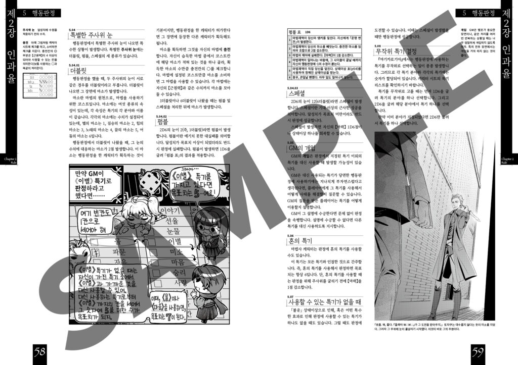 여기에서는 『마기카로기아』의 기본적인 규칙을 소개합니다. 이 장을 읽으면 행동판정을 하는 방법, 게임 진행 방식, 마법사의 전투를 처리하는 법 등을 알 수 있습니다.