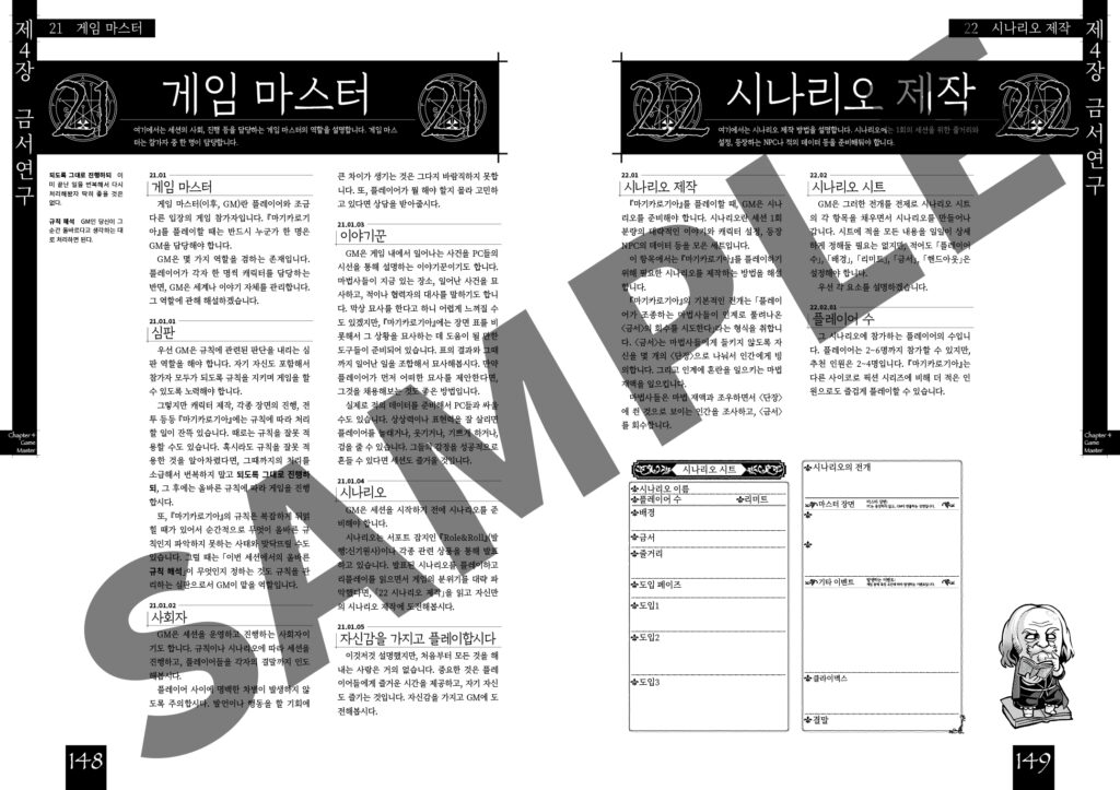 게임 마스터(이후, GM)란 플레이어와 조금 다른 입장의 게임 참가자입니다. 『마기카로기아』를 플레이할 때는 반드시 누군가 한 명은 GM을 담당해야 합니다.