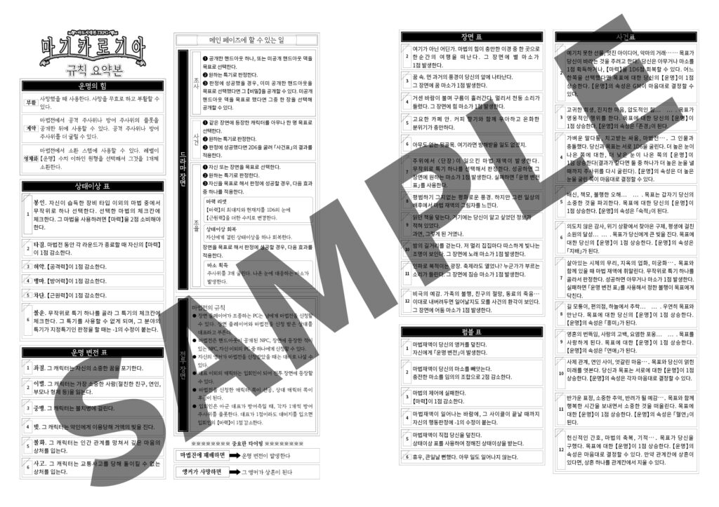 이 장에는 『마기카로기아』를 플레이하기 위해 필요한 시트류, 세션을 관리하고 운용할 때 편리하게 사용할 수 있는 요약본이나 색인 등을 수록했습니다. 복사해서 이용하시기 바랍니다.